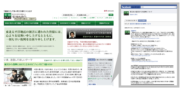 新しいウェブサイトでは facebook などを活用し言論NPOに参加する有識者の意見を収拾。東日本大震災後の復興など日本が抱える様々な課題の解決に向け、多くの市民が参加して一緒に考える「議論のプラットフォーム」としての役割をめざしている。