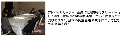 2.本年度はアドバイザリーボードの組織を9名体制に大きく発展させ、小林陽太郎氏、宮内義彦氏、佐々木毅氏ら従来のメンバーに加え、宮本雄二氏(前駐中国大使)、増田寛也氏(元総務大臣)、武藤敏郎氏(前日銀副総裁)が加わり、隔月で開催されるアドバイザリーボード会議を中心に活動の助言役として言論NPOの活動に参加していただいています。