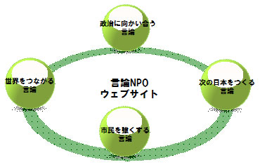平成22年度は、昨年度リニューアルしたウェブサイトを中心に、4つの言論「政治に向かい合う言論」、「世界とつながる言論」、 「市民を強くする言論」、「次の日本をつくる言論」を柱に参加型の議論を完成させます。特に「市民を強くする言論」内で、市民が社会の課題解決に向けた議論を行なえる議論のプラットフォームを作ることで、言論NPOのミッションを達成していきます。また、今年度は言論NPO内の議論から提案を出していく仕組みを構築します。言論NPOの議論をより参加型で市民に開かれたものに変え、それと同時に提案を出していくことで、議論をより影響力のあるものへと発展させていきます。