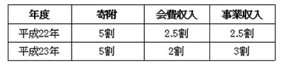 これらの会員・顧客基盤の強化・拡大による会費収入と事業収入の増加及び寄附金収入を増加することにより、平成22年度は、会費収入および事業収入が全体の5割、残りの半分を寄附収入で成り立たせる資金基盤の多様化を実現します。