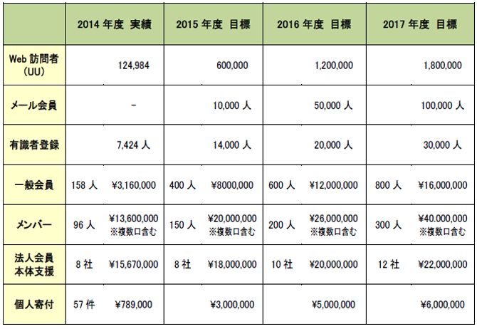 私たちが達成しなければならない目標(下記の表参照)は、3年後には言論NPOの組織を運営するための事業(プロジェクト等を除く)が、会費や本体への寄付で賄われる水準です。27年度は、言論ネットワークの中心的な基盤として、「四つの言論」に参加する多くの有識者を会員として組織化すると同時に、メンバーの3年後300人体制に向けて計画的に50人強の増員を実現させます。また、言論NPOの様々な言論活動に参加できる一般会員をまず今年は400人まで増加させると同時に、言論NPOのサポーターを広げるために、ウェブサイトの訪問者やメールマガジンの登録者等にもそれぞれ目標を定め、計画的に取り組みます。そのために、ウェブサイトの刷新やソーシャル・メディアと連動した発信や既存メディとの連携も進めます。