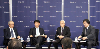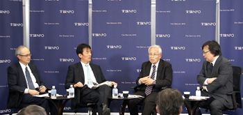 The three-way debate, moderated by Genron NPO President Yasushi Kudo, also discussed the roles of the Group of Seven major economies at their annual leaders' meeting, to be held in Japan in late May.
