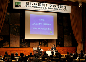 His address was followed by a brief keynote debate between Norio Mitsuya, Senior Vice Minister of Foreign Affairs, and Kudo, in which Mitsuya voiced high expectations on the private sector to play a larger role in diplomatic challenges. He noted that direct people-to-people dialogue should be a shortcut to the resolution of conflicts, if the deterioration of public sentiment toward any particular country is based on misunderstanding and prejudice," he reasoned.