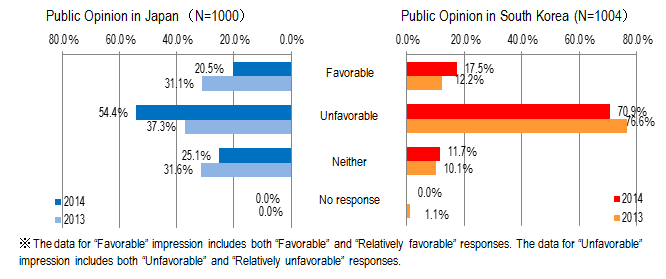 The impression of South Korea among the Japanese public was further aggravated. Although the impression of Japan among the South Korean public had slightly improved, 70% still had negative impression on Japan.