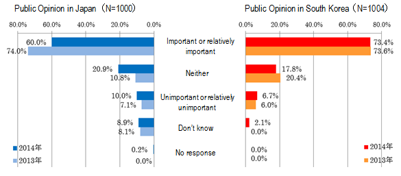 People who consider Japan-South Korea relations as "important" (including "relatively important", the same shall apply hereafter) were the majorities in both Japan (60.0%) and South Korea (73.4%). In Japan, however, there was a significant decrease from the last year's result" (74.0%) by 14 points.