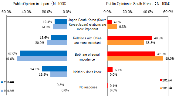 On the question of importance between Japan-South Korea (South Korea-Japan) and Japan-China (South Korea-China) relations, nearly half of the respondents answered that "both are of the same importance" at 47.0% (49.6% last year) for Japanese and at 47.0% (55.0% last year) for South Koreans. It is also worth noting that the response by South Koreans that "South Korea-China relations are more important" had increased from 35.8% (last year) to 43.8%.