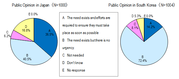 About 80% think that leaders' diplomatic activities are necessary in Japan and South Korea, yet 72% of South Koreans say, "the need exists but there is no urgency".