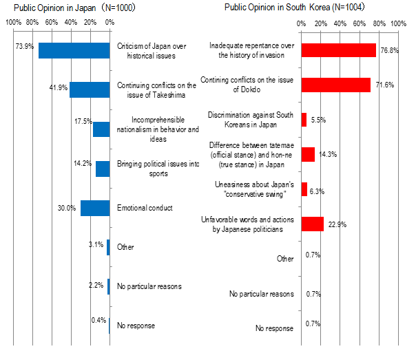 As for the reason why the South Korean public had unfavorable impressions of Japan, over 70% of the respondents answered "Inadequate repentance over the history of invasion" and "Continuing conflicts on the issue of Dokdo" respectively. "Unfavorable words and actions by Japanese politicians" was over 20%. In comparison, the Japanese raised the concern with "criticism of Japan over historical issues" at 73.9%, which was much higher than last year (55.8%).