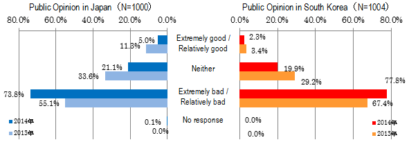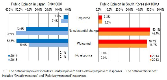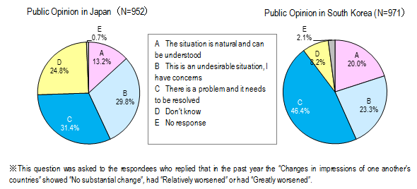 60% of Japanese respondents and about 70% of South Korean respondents think that the worsening national sentiment is "undesirable" and "problem".