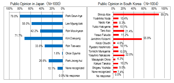In response to the question "what will come up when one another's countries are mentioned?" Japanese respondents showed various interests, such as "Korean cuisine" (46.0%), "Korean TV drama and K-POP" (36.3%) and "sinking of the MV Seoul" (38.2%). Although the "issue of Takeshima Island" (36.7%) and "comfort women" (31.0%) were also significant, the Japanese public opinion is not concentrated on these issues. Whereas, South Korean respondents' answers show their concerns over the conflicts between Japan and South Korea, especially on the "issue of Dokdo" (66.5%) and "comfort women" (55.8%), then followed by "unfavorable words by politicians" (24.3%) and "the Japanese Prime Minister Shinzo Abe" (19.7%). The South Korean respondents who answered "Japanese cuisine", "high-quality industrial products", "Mount Fuji", "sakura", "manga/anime" etc. were all remaining at around 10%. In response to the question on "historical events or incidents in Japan and South Korea that you know" the most prevalent answer among the Japanese was "Seoul Olympics" (67.0%), followed by "Japan/South Korea World Cup" (63.0%). On the other hand, the top answers on the South Korean side concentre on the events of World War II. "Japanese invasion of then Korea by Hideyoshi Toyotomi (1592-98)" (86.3%) was the most popular answer, followed by "atomic bombings of Hiroshima and Nagasaki" and "forced annexation of Korea by Japan", which was 14 points higher than that of last year. In response to the question on "Japanese/South Korean politician that you know", the top answer of the Japanese side was "Park Geun-hye" at 79.8%, which had increased significantly from the last year's 51.9%. On the South Korean side, "Shinzo Abe" was the leading answer at 89.3%, which was 23.1 points higher than last year. While many of the Japanese know other successive presidents of South Korea, only around 10% of the South Korean public knows other successive prime ministers of Japan, except Junichiro Koizumi (55.9%).