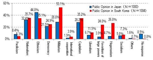 Majority of South Korean respondents answered that the current system in Japan is "militarism", while most Japanese respondents answered that the current system in South Korea is "ethnicism".