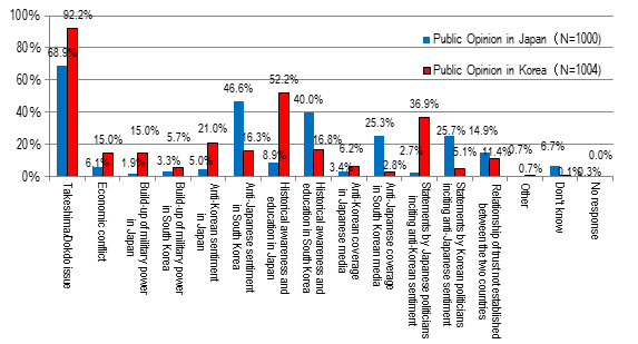 Regarding hindrances on the development of bilateral relations, the "Takeshima/Dokdo issue" was prevalent for both countries: 68.9% (83.7% last year) of the Japanese and 92.2% (94.6% last year) of the South Korean chose the answer.
