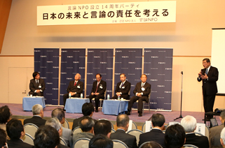 The Genron NPO's president Yasushi Kudo opened discussion as chair on "The Future of Japan and the Responsibility of Debate" with advisory board members Kazuo Ogoura, Mitsuo Ohashi, Yuji Miyamoto and Ichiro Fujisaki. They also reflected on the late Yotaro Kobayashi's contributions to democracy in Japan and agreed on the importance of public debate for the future of Japan.