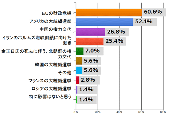 ○米国大統領選挙とEU財政危機は、日本への影響があるのは確実と予測できるが、その他の事象は日本への影響を予測するのが難しいため。(50代、自営業)