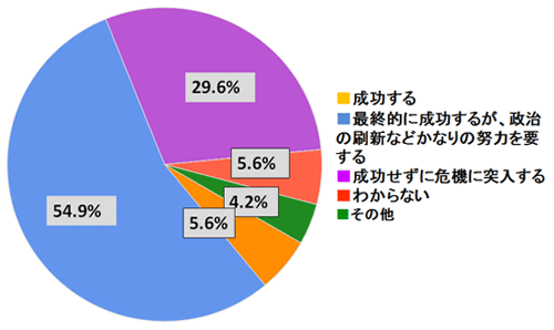 ○現在の政治家及び政治体制のままでは成功はしない。現在の政治家(+官僚)は過去の失敗に対して謙虚に反省し、既得権益に捉われない、新しい政治家と交代すべきである。上述の通り、現在の政治・行政機構は過去の成功体験と既得権益に縛られ過ぎており、現在・今後の更なる変化に対応する事が出来ない。今後の変化に対応して行く為には、その変化に順応出来る能力・資質を持った人たちがリードして行かなければならない。(50代、企業経営者・幹部)