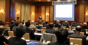 3月17日、言論NPO代表の工藤は、千葉県で開催された「毎日新聞企業人大学※」に出席し、「政府外交と民間外交 ―言論NPOの挑戦」と題して講演を行いました。今回の講演には加盟社の幹部や公募読者ら約40名が参加しました。