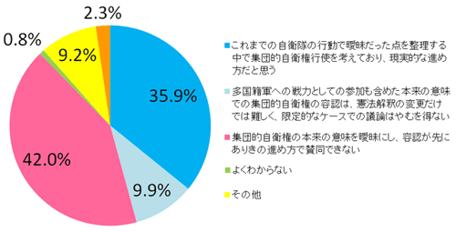 問3.集団的自衛権の行使は本来、他国に加えられた攻撃を自国にも加えられたものと考え、他国と共同で自衛権を行使するために海外に派兵するという概念です。しかし、安倍首相はそのような行動には参加しないとしており、むしろ限定的なケースや必要最小限の範囲での行動のために、集団的自衛権の容認が必要という形で議論が動いています。こうした議論の進め方をあなたはどう見ていますか。【単数回答】