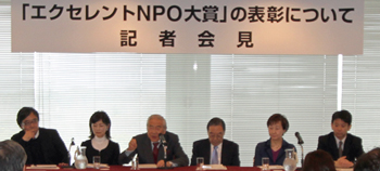 3月6日、都内にて、「エクセレントNPO年間大賞表彰」についての記者会見が行われ、代表工藤は「『エクセレントNPO』をめざそう市民会議」(以下、市民会議)の事務局長及び本事業のプロデューサーとして、年間大賞の概要や審査方法を公表しました。記者会見には、市民会議共同代表の小倉和夫氏(国際交流基金顧問)、國松孝次氏(救急ヘリ病院ネットワーク理事長)、島田京子氏(横浜市芸術文化振興財団代表理事・専務理事)の三氏の他、市民会議理事の田中弥生氏(大学評価・学位授与機構准教授)、堀江良彰氏(難民を助ける会事務局長)が参加しました。