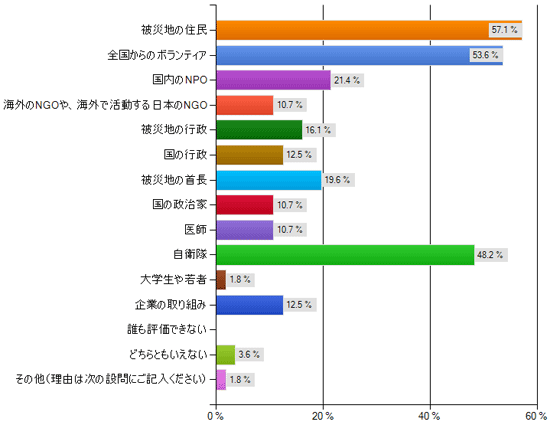 ○被災地の救援、復興支援活動の全体像は未だ把握されていないので、断定することは難しいが、関係者からの意見や情報、報道の傾向から、自衛隊、医師、NGOを挙げた。(50代、学者・研究者)