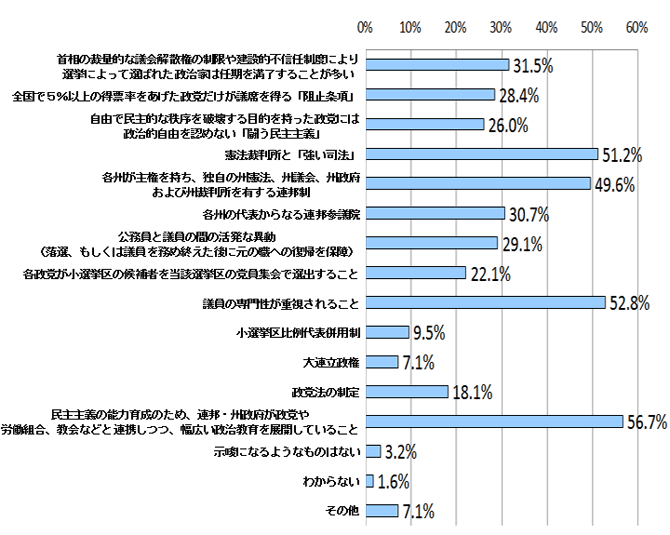 また「議員の専門性が重視されること」が52.8%と続き、専門的な知識を有する議員の重要性も指摘されています。他にも「憲法裁判所と『強い司法』」や「各州が主権を持ち、独自の州憲法、州議会、州政府および州裁判所を有する連邦制」との回答もそれぞれ51.2%と49.6%に上るなど、国家制度そのものについても日本がドイツから学ぶことがある、と考えている有識者が多いことがわかります。