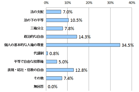 そのデモクラシーの中で、最も重要な基準は何かを尋ねたところ、最多の回答は「個人の基本的な人権の尊重」で、34.5%だった。これに続くのは「政治的な自由」が14.3%、「表現・結社・信教の自由」が12.8%、「法の下の平等」が10.5%といずれも1割程度にとどまっており、日本の有識者は「個人の基本的な人権の尊重」を特に重要視していることが浮き彫りとなっている。