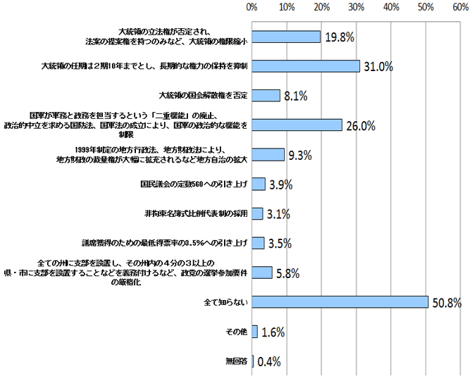 比較的知られている項目としては、「大統領の任期は2期10年までとし、長期的な権力の保持を抑制」(31.0%)、「国軍が軍務と政務を担当するという『二重機能』の廃止、政治的中立を求める国防法、国軍法の成立により、国軍の政治的な機能を制限」(26.0%)、「大統領の立法権が否定され、法案の提案権を持つのみなど、大統領の権限縮小」(19.8%)などがあった。