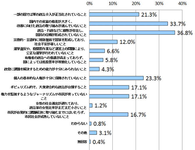 アジアの民主主義国の課題について尋ねたところ、「政治・行政などに腐敗が存在し、国民の信頼が形成されていないこと」(36.8%)と、「国内での貧富の格差が大きく、改善に向けた政治の取り組みが進んでいないこと」(33.7%)の2つが3割を超えた。