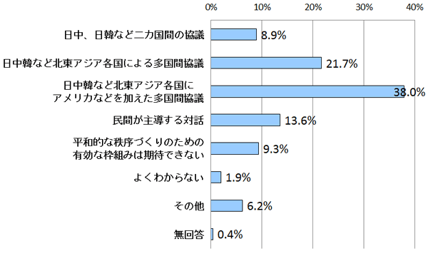 その結果、「日中韓など北東アジア各国にアメリカなどを加えた多国間協議」が38.0%と4割近くにのぼり、最多となった。これに「日中韓など北東アジア各国による多国間協議」が21.7%で続いている。有識者は多国間の枠組みを重視しているが、その際、アメリカの参加をポイントとして見ていることが浮き彫りとなった。