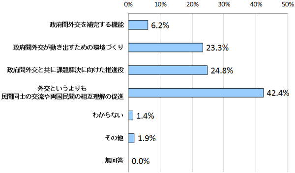 また、「政府間外交と共に課題解決に向けた推進役」(24.8%)、「政府間外交が動き出すための環境づくり」(23.3%)と、より積極的な役割を期待する声もそれぞれ2割程度見られた。