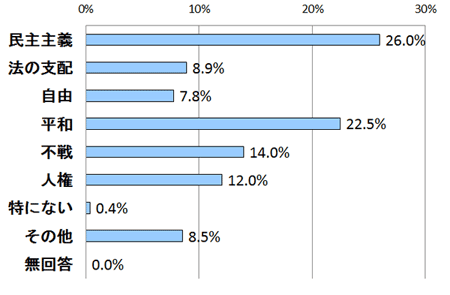 目指すべき価値観や理念として最多の回答は「民主主義」