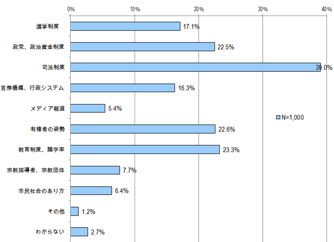 インドネシア人で最も多い回答は、「司法制度」の39.0%で、次いで、「教育制度、識字率」が(23.3%)、「有権者の姿勢」(22.6%)、「政党、政治資金制度」(22.5%)が並んでいる。