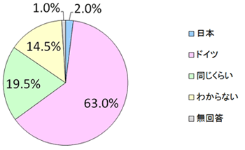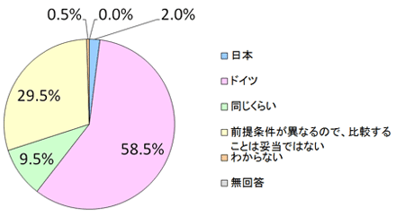 日本とドイツが、戦後70年を迎える中、これまで両国のどちらがより近隣国と和解のための努力をしてきたと思うかを尋ねたところ、「ドイツ」が58.5%でと6割近くにのぼり、「日本」の2.0%を大きく上回った。ただ、「前提条件が異なるので、比較することは妥当ではない」との見方も29.5%と3割程度存在している。