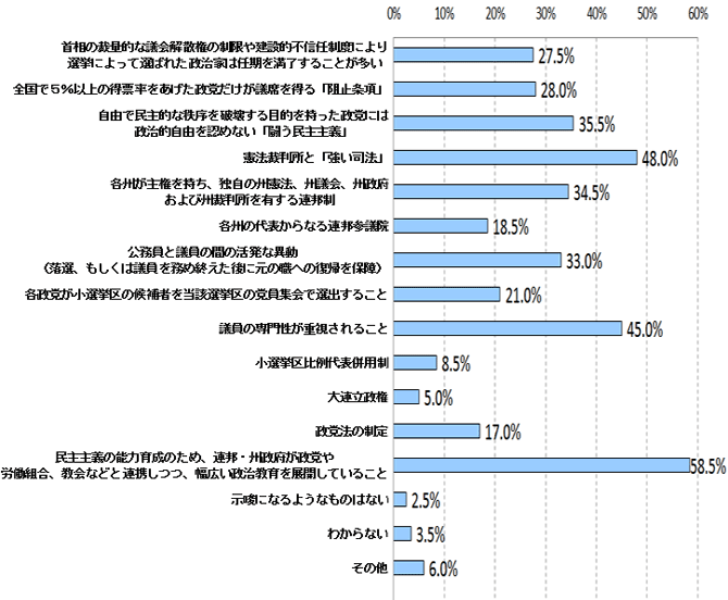 日本に示唆を与えるドイツの特徴的な政治や制度を複数回答形式で尋ねたところ、「民主主義の能力育成のため、連邦・州政府が政党や労働組合、教会などと連携しつつ、幅広い政治教育を展開していること」が58.5%で最も多く、多くの有識者は、政治教育の仕組みが整っているドイツから学ぶものがあると考えている。