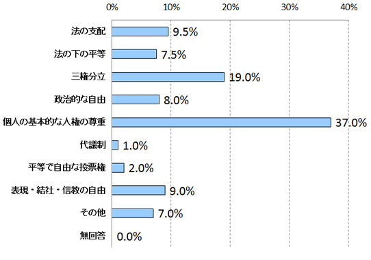 そのデモクラシーの中で、最も重要な基準は何かを尋ねたところ、最も多かったのは、「個人の基本的な人権の尊重」で、37.0%だった。これに「三権分立」が続いているが、19.0%と2割を切り、以下、「法の支配」(9.5%)、「表現・結社・信教の自由」(9.0%)、「政治的な自由」(8.0%)と、いずれも1割に満たなかった。日本の有識者は、「個人の基本的な人権の尊重」を特に重要視していることが浮き彫りとなっている結果となった。