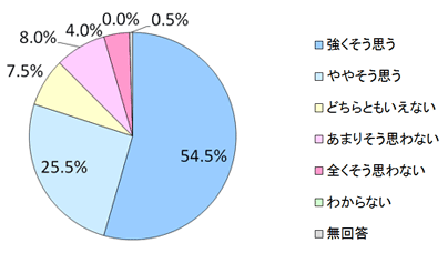 その結果、「そう思う」(「強く」、「やや」の合計)が80.0%と8割に達し、「そう思わない」「全く」、「あまり」の合計)の12.0%を圧倒している。