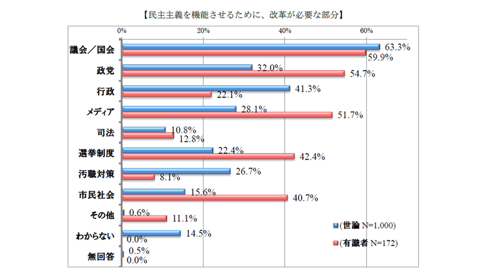 これに対して、有識者の最も多くの人が「議会/国会」(59.9%)の改革や立て直しが必要だと回答しているのは世論調査と同じだが、これに続くのが「政党」(54.7%)、「メディア」(51.7%)で5割を越え、「選挙制度」(42.4%)、「市民社会」(40.7%)が4割を超えるなど、世論調査に比べて、分散傾向にある。