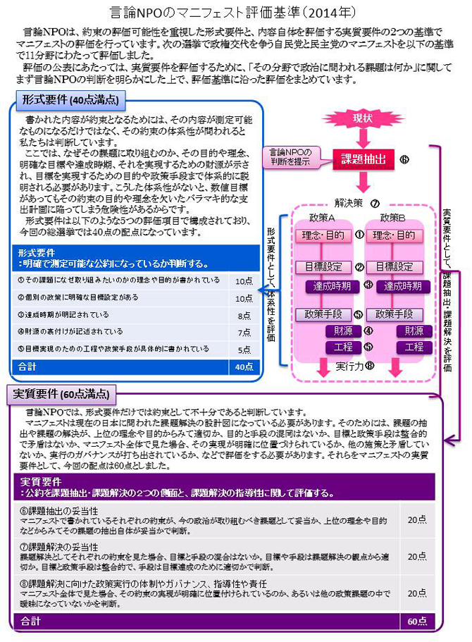 言論NPOの評価基準とは、①公約が有権者にとって明確で約束として判断可能なものとなっているか、の形式基準と、②課題の解決案としての妥当性や実現に向けての体制や説明責任を判定する実質基準で構成されており、2つの基準の8項目でそれぞれの公約を審査している。