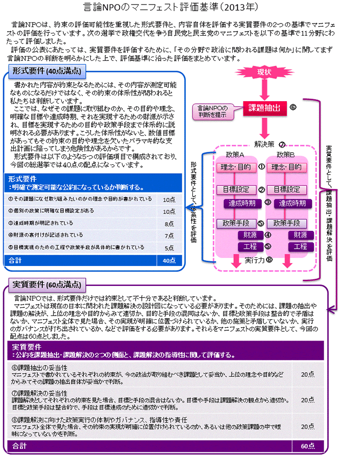 言論NPOの評価基準とは、①公約が有権者にとって明確で約束として判断可能なものとなっているか、の形式基準と、②課題の解決案としての妥当性や実現に向けての体制や説明責任を判定する実質基準で構成されており、二つの基準の8項目でそれぞれの公約を審査している。