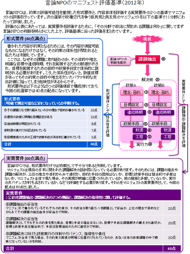 言論NPOのマニフェスト評価は上記のように、民主党と自民党、公明党、日本未来の党、そして参考の日本維新の会を加え、5党で行っている。これらの点は100点満点で示され、11の政策分野を言論NPOが定める形式要件と実施要件の二つの評価基準、8つの評価項目で評価を行い、総合点は11の分野の平均点で示している。 (評価基準に関しては、2ページを参照)。