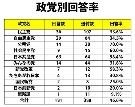 今回の候補者アンケートは、日本が直面する政治課題をどう認識し、解決の方向をどう描いているかを、候補者に伺うもので、10の党と無所属の388人にアンケートを送付し、7月3日までに回答のあった181人を集計しました。送付者に対する回答者の党別の回答率は、共産党が98.4%と最も高く、公明党は70.0%、社会民主党60.0%と続いています。民主党は33.6%、自民党は34.5%でした。