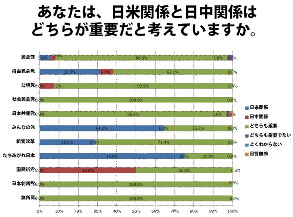 日米関係が大事と言い切る候補者が半数を越えるのは、「たちあがれ日本」の3人(75%)、「みんなの党」の9人(64.3%)で、自民党は9人(31%)、民主党は2人(5.6%)に過ぎません。
