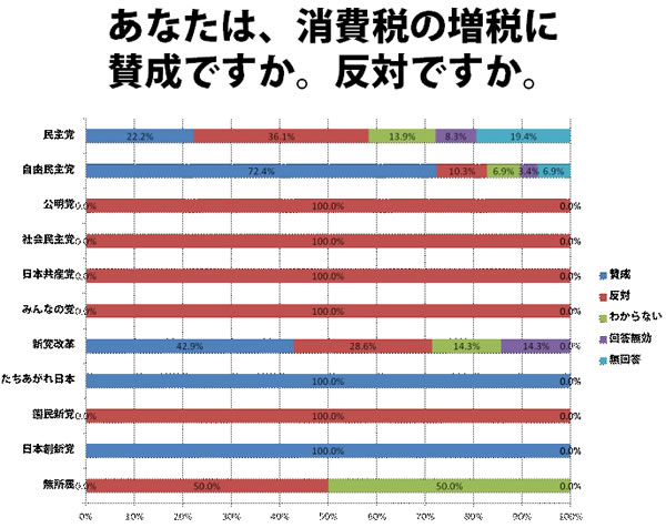ただし、消費税の増税に賛成か、では「たちあがれ日本」と「日本創新党」が全員賛成しており、自民党は21人(72.4%)の候補者が賛成と回答しています。