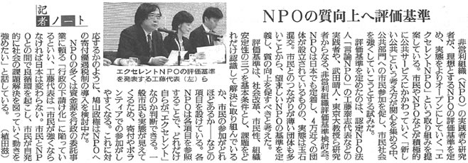 非営利組織(NPO)の実践者や研究者が、理想とするNPOの評価基準を定め、実践をよりオープンにしていく「エクセレントNPO」という取り組みを提唱している。