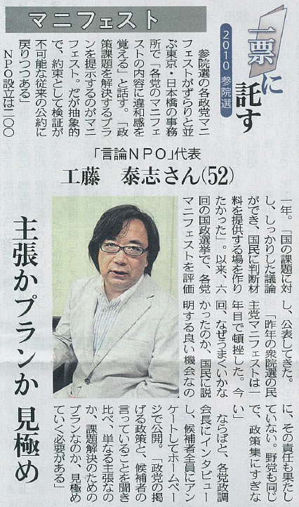 参院選の各政党マニフェストがずらりと並ぶ東京・日本橋の事務所で「各党のマニフェストの内容に違和感を覚える」と話す。「政策課題を解決するプランを提示するのがマニフェスト。だが抽象的で、約束として検証が不可能な従来の公約に戻りつつある」
