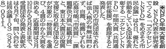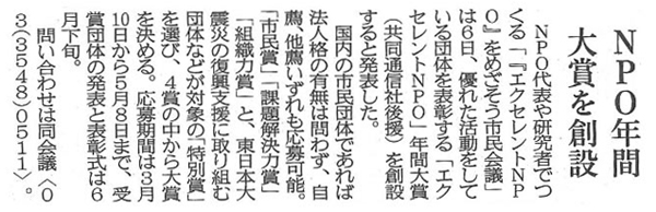 NPO代表や研究者でつくる「『エクセレントNPO』をめざそう市民会議」は6日、優れた活動をしている団体を表彰する「エクセレントNPO」年大賞(共同通信社後援)を創設すると発表した。