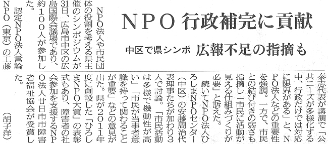 NPO法人や市民団体の役割を考える県主催のシンポジウムが31日、広島市中区の広島国際会議場であり、約100人が参加した。