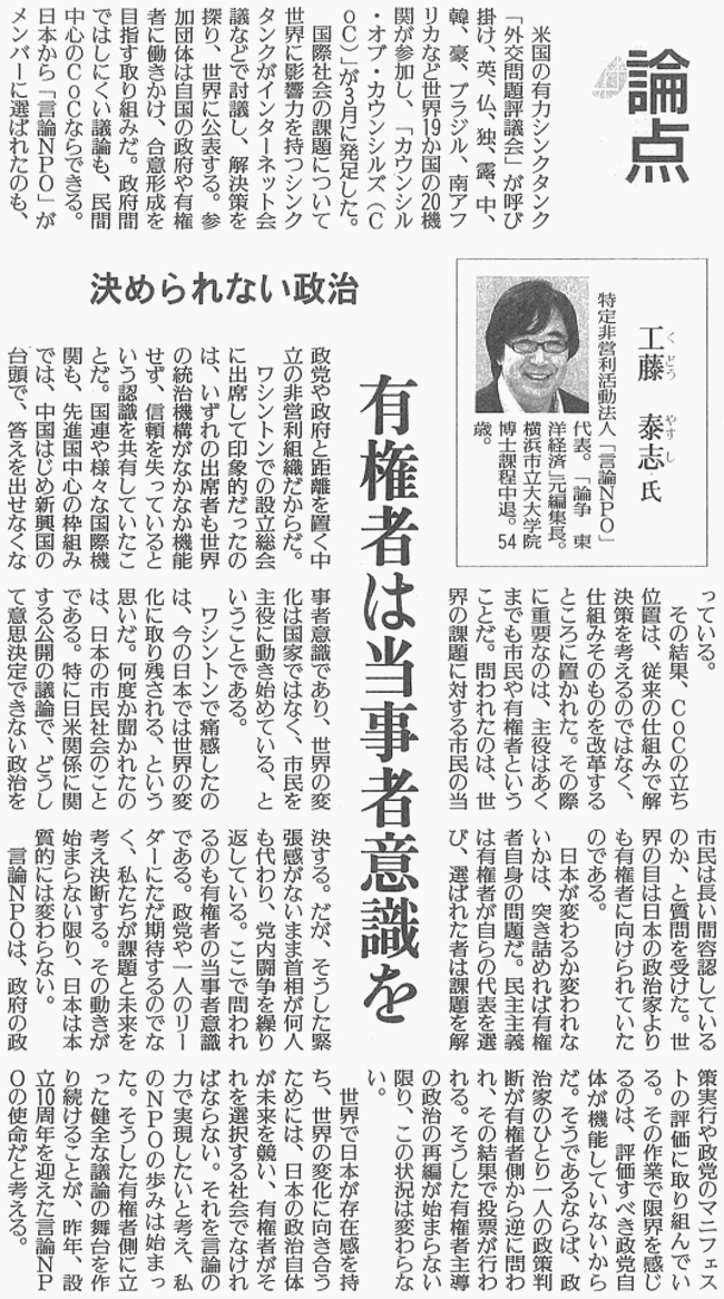 米国の有力シンクタンク「外交問題評議会」が呼び掛け、英、仏、独、露、中、韓、豪、ブラジル、南アフリカなど世界19か国の20機関が参加し、カウンシルズ・オブ・カウンシルズ(COC)が3月に発足した。国際社会の課題について世界に影響力を持つシンクタンクがインターネット会議などで討議し、解決策を探り、世界に公表する。参加団体は自国の政府や有識者に働きかけ、合意形成を目指す取り組みだ。
