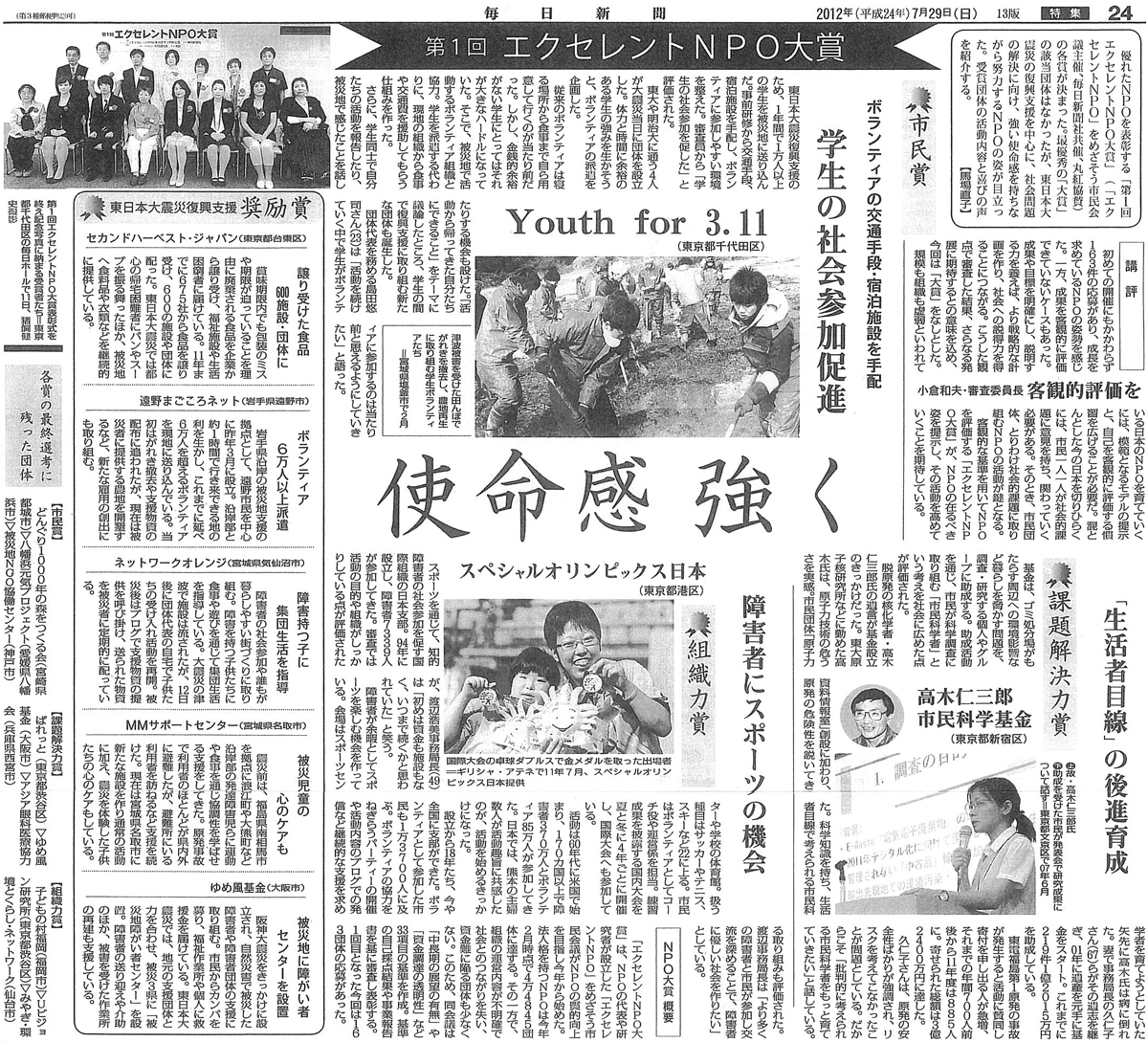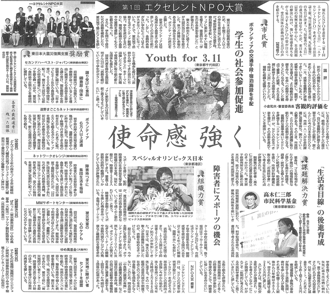 優れたNPOを表彰する「第1回エクセレントNPO大賞」の各賞が決まった。最優秀の「大賞」の該当団体はなかったが、東日本大震災の復興支援を中心に、社会問題の解決に向け、強い使命感を持ちながら努力するNPOの姿が目立った。受賞団体の活動内容と喜びの声を紹介する。