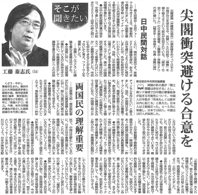 尖閣諸島の領有権をめぐって日本と中国が対立を深める中、民間レベルの対話で「障害」を乗り越えようという試みが注目されている。「東京-北京フォーラム」の日本側主催者、工藤泰志・言論NPO代表に聞いた。