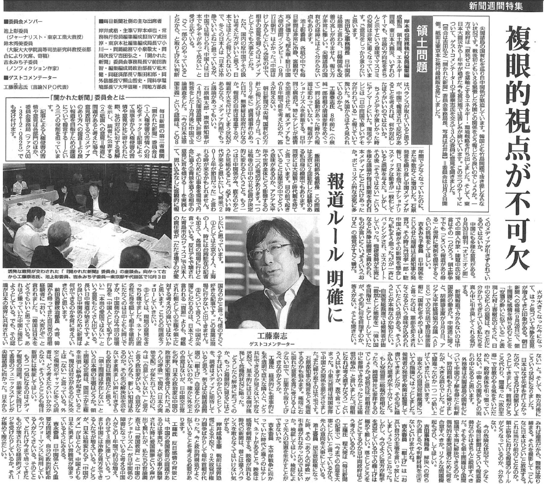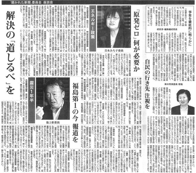 尖閣諸島の国有化を巡り日中関係が緊迫しています。韓国とも竹島問題で抜き差しならない状況です。戦後初ともいえる緊張した外国との関係をどう報じたら良いのでしょうか。一方で政府は「原発ゼロ」を基軸とするエネルギー・環境戦略を打ち出しました。そして、東日本大震災から1年半が過ぎた今も被災地では苦しみが続いています。この三つのテーマについて、ゲストコメンテーターの工藤泰志氏を交えて3人の委員に意見を聞きました。(紙面より抜粋)
